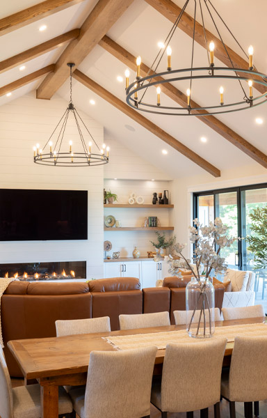 Walking through the foyer, you are amazed by the 16-17-foot-high cathedral ceilings and wood-beamed great room. The feature wall of white shiplap extends upward. Here, a large tv hangs over the simple black gas fireplace, flanked by built-in white shelves and cabinets. A curved leather reclining sofa is set up to watch the television, and two comfy armchairs sit in front of the wall of windows. Most of the furniture throughout the house was purchased at Orangeville Furniture. Twin wrought iron and faux candle chandeliers hang dramatically from the centre beam. Standing in the great room, your eyes are drawn to large windows and panoramic views.