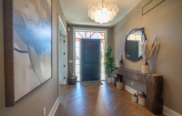 Restful and inviting walls of taupe in the foyer support a large black framed mirror over a rustic barn-wood table that Paul designed.