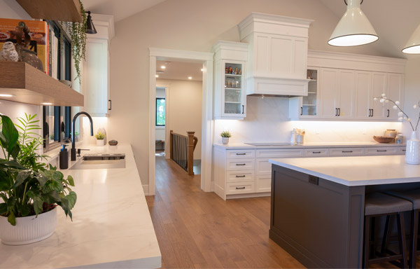 The countertops of the large island and kitchen are stunning white quartz, and continue up the walls, as a backsplash. Within the island, there is a bank of large drawers painted black and a cleverly concealed microwave.