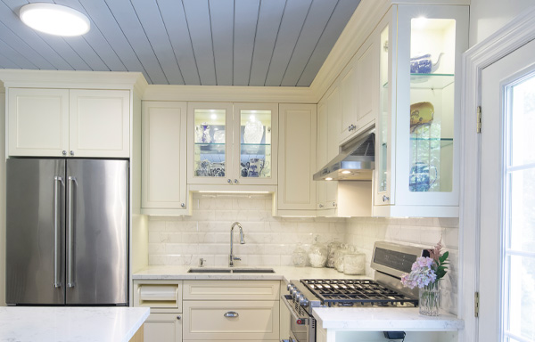 Another aspect of the project was the installation of a fixture that harkens back to an early age of homebuilding and that is its “shiplap” ceiling. Shiplap is wood paneling that is made of long, usually horizontal panels with a gap between the boards. “The wood had to be specially milled to get the extra-long pieces Airik required.”