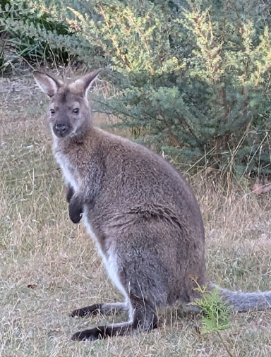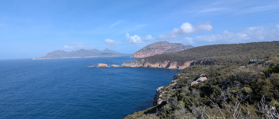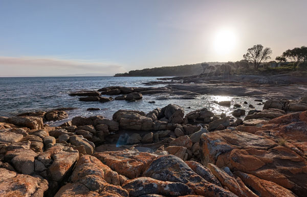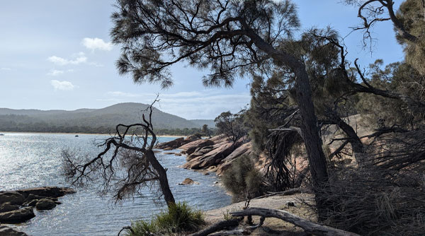 I visited Freycinet in 2016, now nine years later, I’m still awe-struck by the captivating allure of its famous barren summits. The Hazards are a range of five adjoining granite peaks, all reaching beyond 400-metres in height. They have a unique pink mineral form of feldspar, amid light quartz and dark mica. This stunning sentinel of rock grandly faces out over the Tasman Sea and Great Oyster Bay. Our view from Edge of the Bay Resort, just outside Coles Bay, is an impressive location, with a private beach overlooking the sea, facing the Hazards range. The cabin’s dramatic outlook is surrounded by a low airy forest of Banksia trees, naturally trimmed by free roaming wallabies. Wild wallabies (like small sized kangaroos) visit us around our deck each morning and evening, while they graze the scrubby woodland for tasty vegetation. Late afternoons we stroll five minutes to the beach to view broken chunks of rock strewn along the shoreline, then challenge our stamina walking in the cool sea.