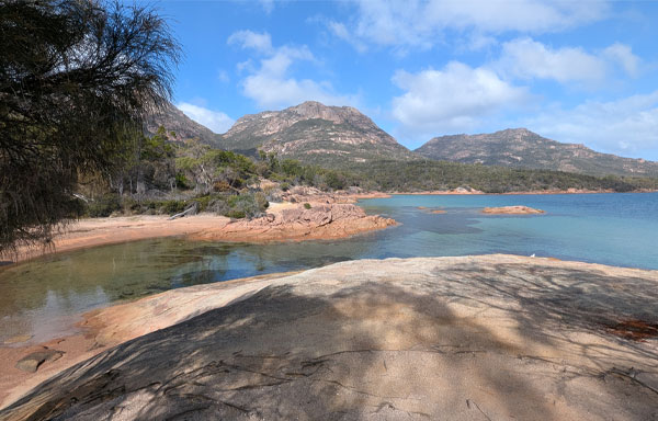 Few places persist to grasp you with lasting amazement as powerfully as Freycinet National Park, on the island of Tazmania, south coast Australia. This magnificent area is a 43 km long peninsula located mid-way down the eastern shore of Tazmania, near the town of Coles Bay. The Hazards mountain range is an imposing geological formation of pink coloured granite, which plunges from sky to sea, with a fingering coastline, and occasional secluded white sand beaches, bordering clear turquoise waters.