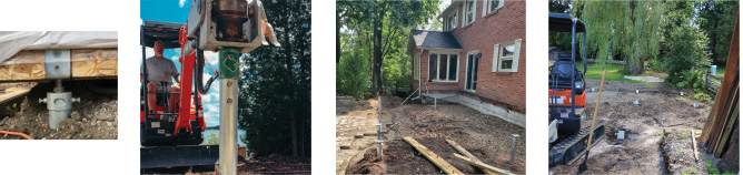 He uses a mini Kubota excavator with an attachment arm on the bucket to install the seven-foot-long piles, which also come with five and three-foot extensions for challenging soil conditions where the piles may have to go deeper to support the structure. Each pile has brackets or ‘heads’ which can be connected to other supporting columns.