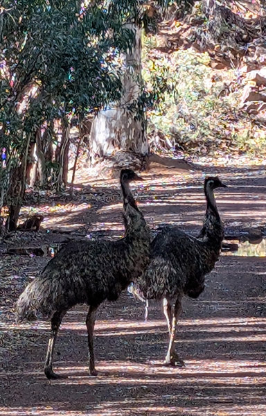 Another camouflaged wild creature, also two-legged like kangaroos, are the emus. Emus are huge flightless birds (weighing 40 to 60 kilos) with a long-necked featherless head and an oversized body adorned by long trailing plumage that flows around their long plump body like a skirt. The day we hike up the valley to the abandoned Old Homestead, we suddenly notice that we are following a pair of emus, silently striding only metres ahead of us on the trail. Matching their slow gate, for twenty minutes, we are speechless in their presence at close range and mesmerized by their gentle peaceful nature. Once we get deeper into the forest, the emus spot their mob, (group of emus) the pair scurry ahead to join in grazing for beetles and lizards in the brush of dappled light beneath a stand of old gums.