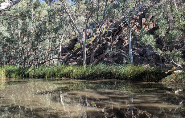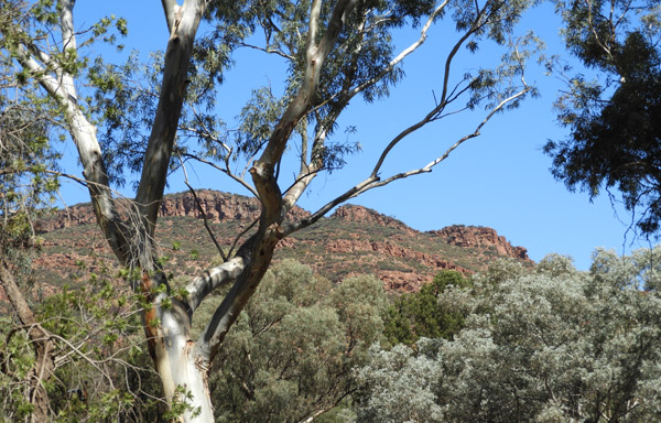 It is remarkable that with the area’s scarce rainfall (less than 300 mm annually) and limited soil, it can support flora of large gum trees, pockets of low scrub saltbush, spikey grasstrees, bunches of prickly wattle and stands of white cyprus pine. The shapely trunks of each gum tree at Ikara, whether smooth sided, stripey barked, or half dead and partly burnt out from fire, have impressive character shapes. The gums endure ongoing drought, living for hundreds of years and their steadfast roots sustain them during floods when torrents of swirling waters, with floating logs, pass by their gigantic trunks. We see evidence of previous flooding during our walk toward the Old Homestead and while exploring the dry riverbed of the Bunyeroo Valley and Gorge, where huge piles of deadwood gums have piled up from a great flood in the 1980s.
