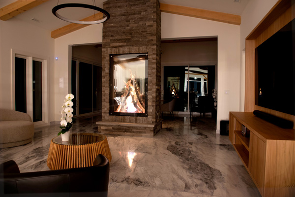 “That was a project that was a partnership with one of our building partners in the area and a builder that we have shared a great relationship with over the past few years. That specific project featured the Maestro Collection by DaVinci Custom Fireplaces with a two-sided 36-inch wide, 58-inch high, see-through fireplace. It is really unique, because this is one of the only fireplaces in the world that you can choose to have heat when you want it, or no heat when you don’t but still have the same amazing fire! When you can have a fireplace that can offer neutral heat to a room, you can basically use it 365 days of the year and when you do need some supplemental heat, you do have that option. Actually, the customer doesn’t really need the fireplace to provide a lot of heat, but if they do decide that they want some, they do. have that ability. It’s a special product for a special home, because having a fireplace that you can have facing indoors and outdoors is a tremendous concept. There is actually a trend now within our industry which is heat management, and, in this case, it’s making that fireplace available for use as often as you would like. If they manage heat correctly, you give people a reason why they can use their fireplace, instead of reasons why they can’t! The build also has a second fireplace in a sitting area in the front of the house, The Fireplace Xtrodinair Pro Builder 42” Cleanface, which offers one of the shallowest and nicest looking fires with a heat management system that allows the customer to put a television above the fireplace if they like, without needing a mantel! It’s a very special unit… good value, but it also comes with some of the same elite features that are usually found in some of the highest-end fireplaces.’